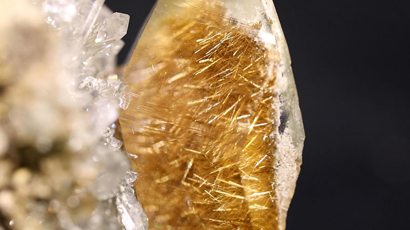 黄金に輝く針状の鉱物が水晶に閉じ込められた鉱物