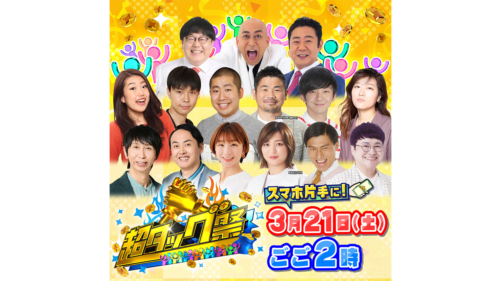 TBSでは、3月21日(土)午後2時から、豪華有名人と視聴者がリアルタイムでタッグを組み賞金獲得を目指す生放送特番『超タッグ祭』を放送する(※一部地域を除く)。進行はTBSアナウンサーの杉山真也と吉村恵里子が担当する。