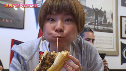 ⇒アンガス牛の赤身のバラ肉をたっぷり炒め、炒めタマネギを加え、パプリカ、薄切りのモッツァレラチーズをトッピング。熱でトロトロになったところで豪快にパンに挟んだら最後の仕上げにチェダーソースをたっぷりとかけたら完成。レギュラーメニューで1本約460g!
